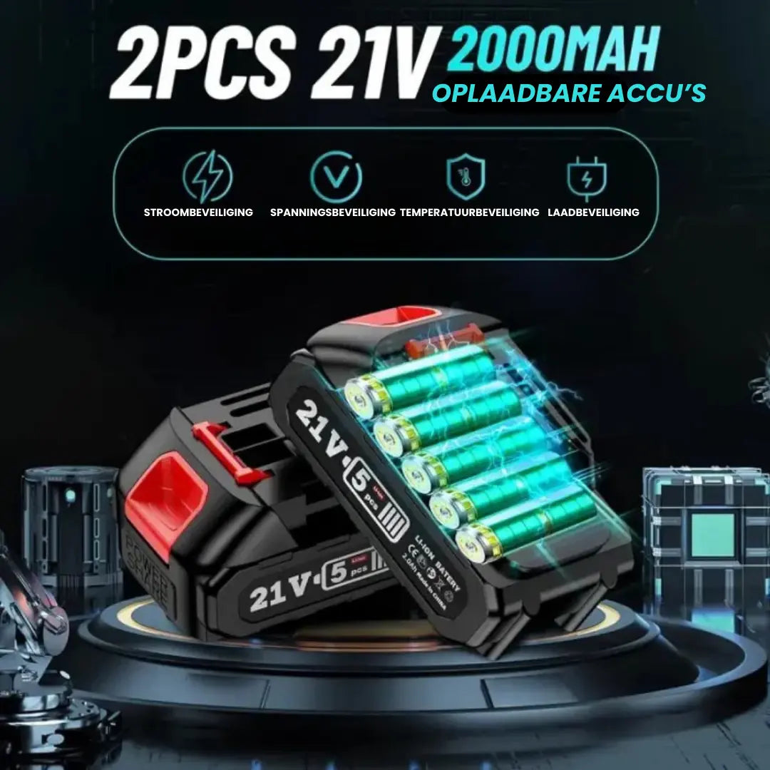 Elke batterij biedt tot 50 minuten intensief gebruik. Dankzij de twee meegeleverde batterijen kun je doorgaan met werken met de ene terwijl de andere oplaadt.